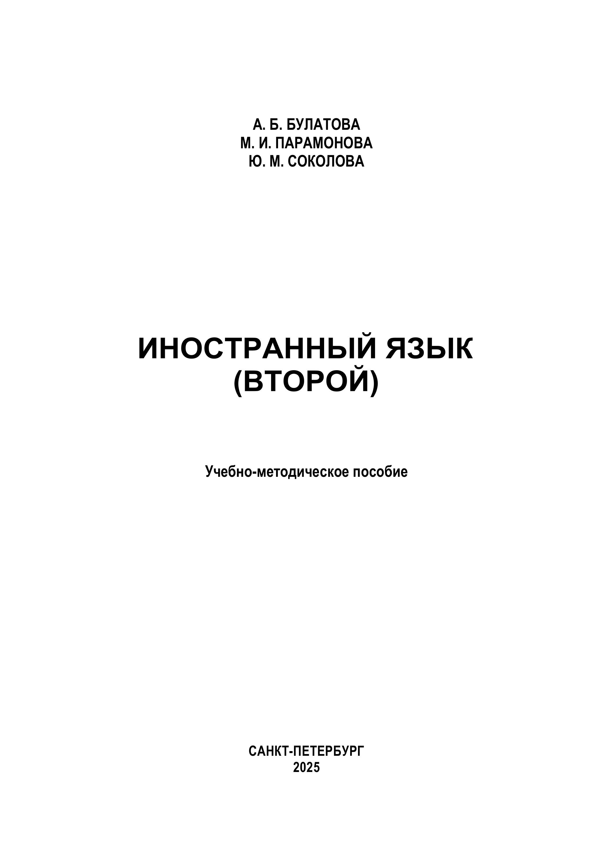 Булатова, Анастасия Борисовна Иностранный язык (второй) [Электронный ресурс] : учебно-методическое пособие / А. Б. Булатова, М. И. Парамонова, Ю. М. Соколова ; рец. О. В. Абыякая, 2025. - 51 с.