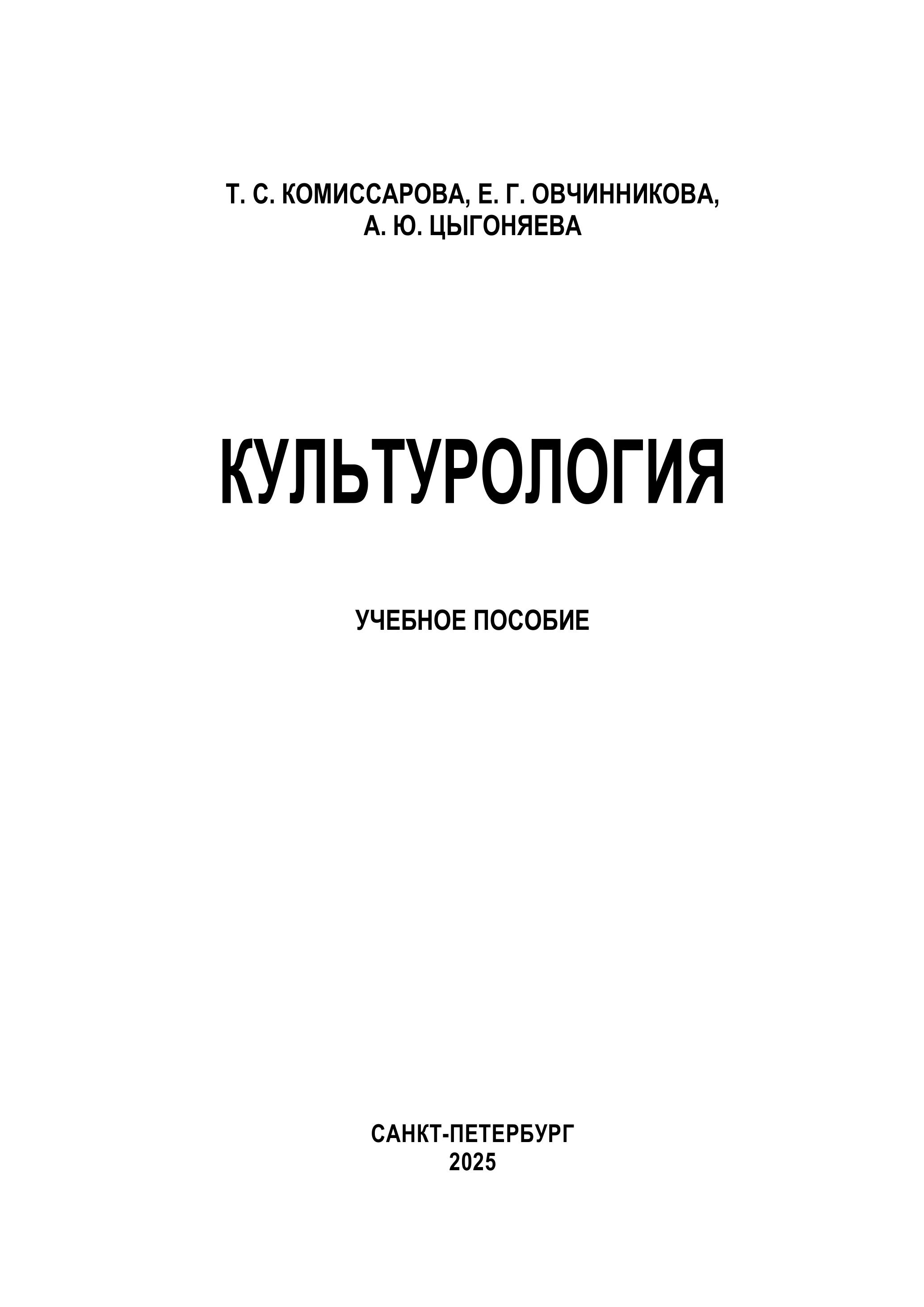Комиссарова, Татьяна Сергеевна Культурология [Электронный ресурс] : учебное пособие / Т. С. Комиссарова, Е. Г. Овчинникова, А. Ю. Цыгоняева ; рец.: Е. А. Терентьева, Т. В. Молчанова, 2025. - 166 с.