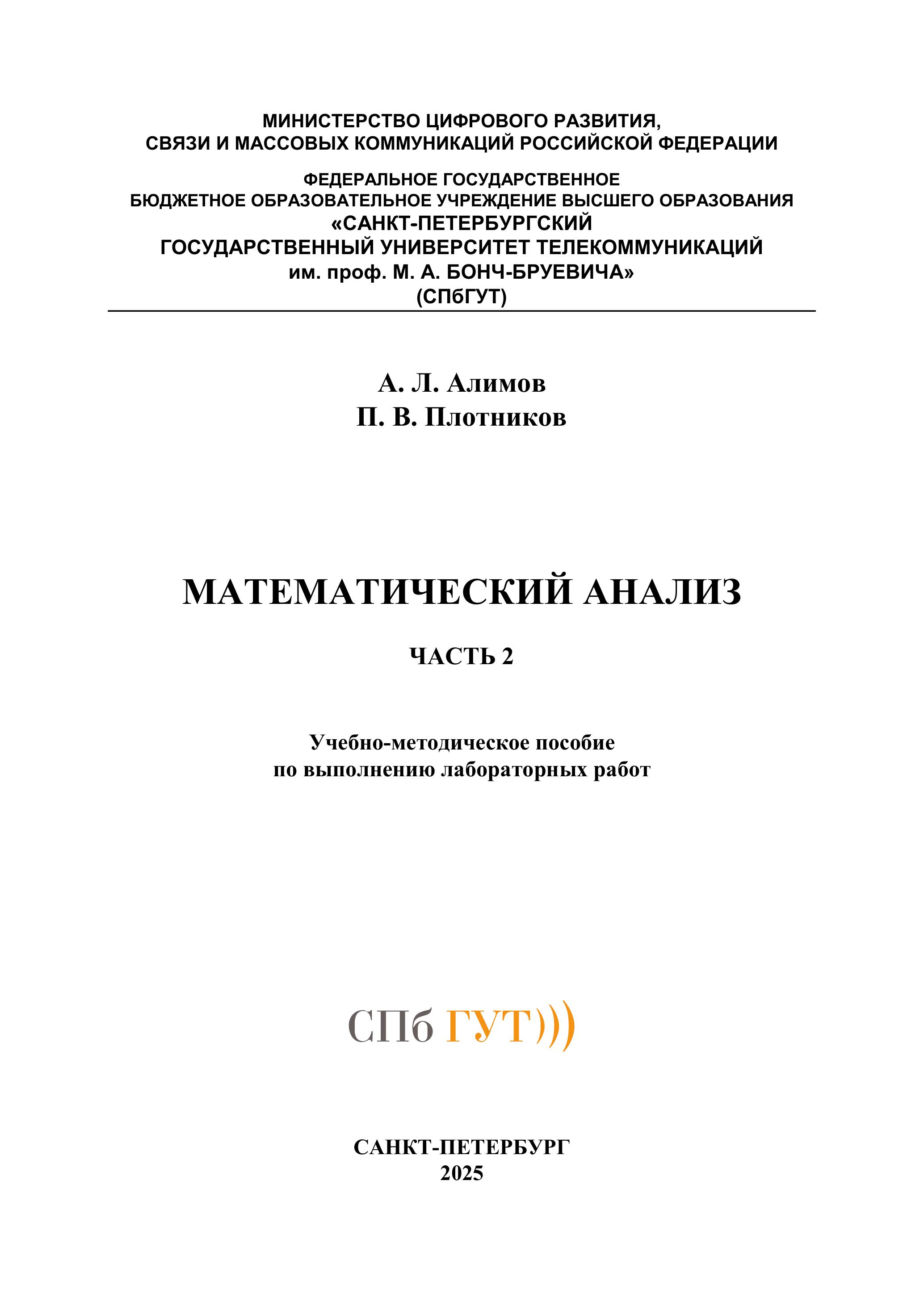 >>> Алимов, Александр Леонидович. Математический анализ : учебно-методическое пособие по выполнению лабораторных работ / А. Л. Алимов, П. В. Плотников ; рец. М. М. Кабардов ; М-во цифрового развития, связи и массовых коммуникаций РФ, С.-Петерб. гос. ун-т телекоммуникаций им. проф. М. А. Бонч-Бруевича. - СПб. : СПбГУТ, 2024 - 2025 (дата обращения: 16.09.2025) . - Режим доступа: свободный доступ из сети Интернет,свободный доступ из локальной сети. Ч. 2. - 2025. - 105 с. - Библиогр.: с. 105. - Б. ц.